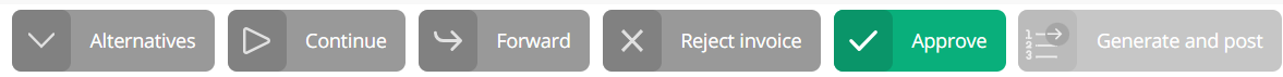 Approve Only available if the invoice is assigned to you. With this you approves the invoice, or what is relevant to you, and sends it to the next step in the workflow, unless you have the last step. When the invoice is approved in all workflow steps, the invoice will have the status "Approved.