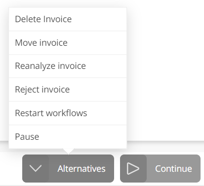 Reject invoice Only available if not disabled by a superuser. This will do the same at the option "Reject invoice" in the "Alternatives" menu: Sets the document to "Rejected" status. Controllers can thus also reject documents that have not been assigned to them. All workflows are interrupted. It is possible to continue the processing of an invoice with the button "Continue": This will also restart all workflows.