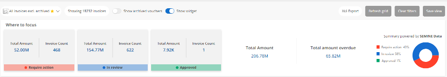 Over a period of time a set of selected Semine customers have been trying out the functionality we call Where to focus – widget. A summary of what we call “active” statuses in SEMINE. This will show you summaries of the invoices with statuses that someone has to do an action on. For the early adopters that got this access and was not a controller function, this feature will be removed. To get it you'll need to have one of the controller roles. If you are a controller of some sort, it is automatically added.