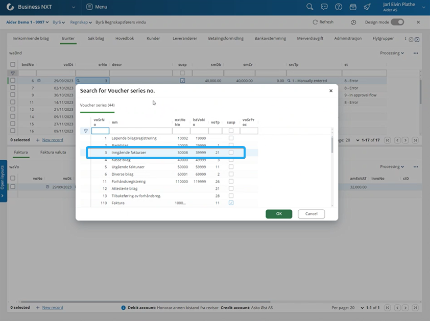 Locate "Incoming invoice" in the list and type "*" on the keyboard to open the "Voucher series number."