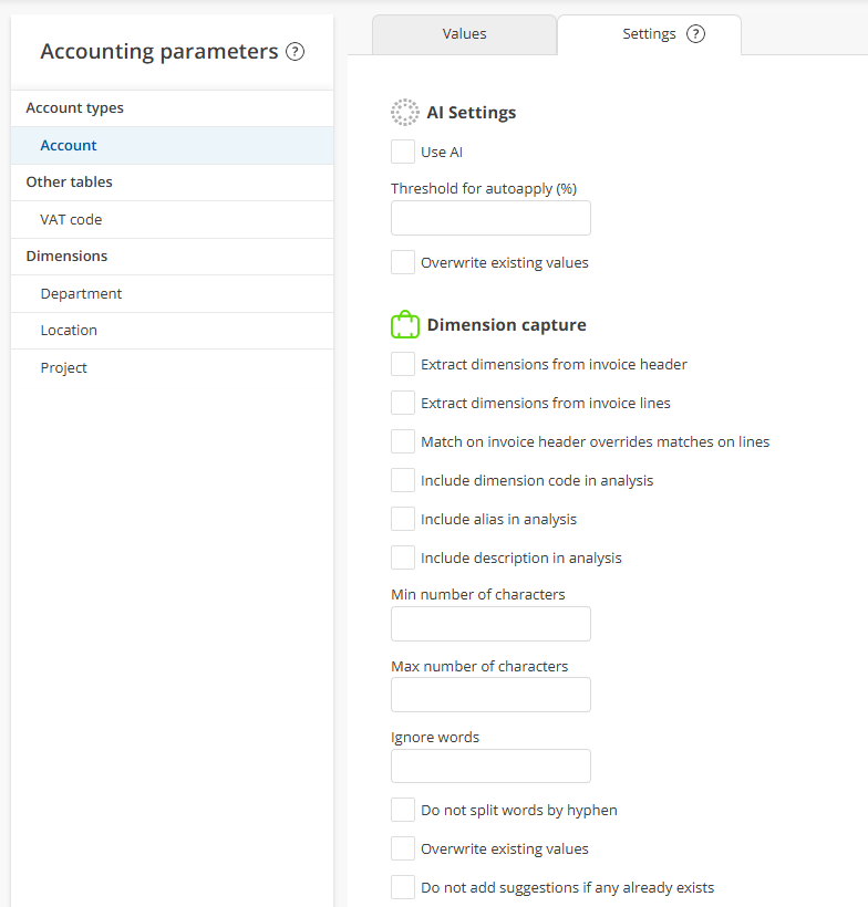 AI training on the selected account parameter occurs when an invoice is posted. It means that the combination Supplier + Words in line description + Selected account parameter value is stored in the training memory and is thus included in the AI suggestions created the next time an invoice is received or when the invoice is restarted. Training does not affect suggestions for already received invoices.