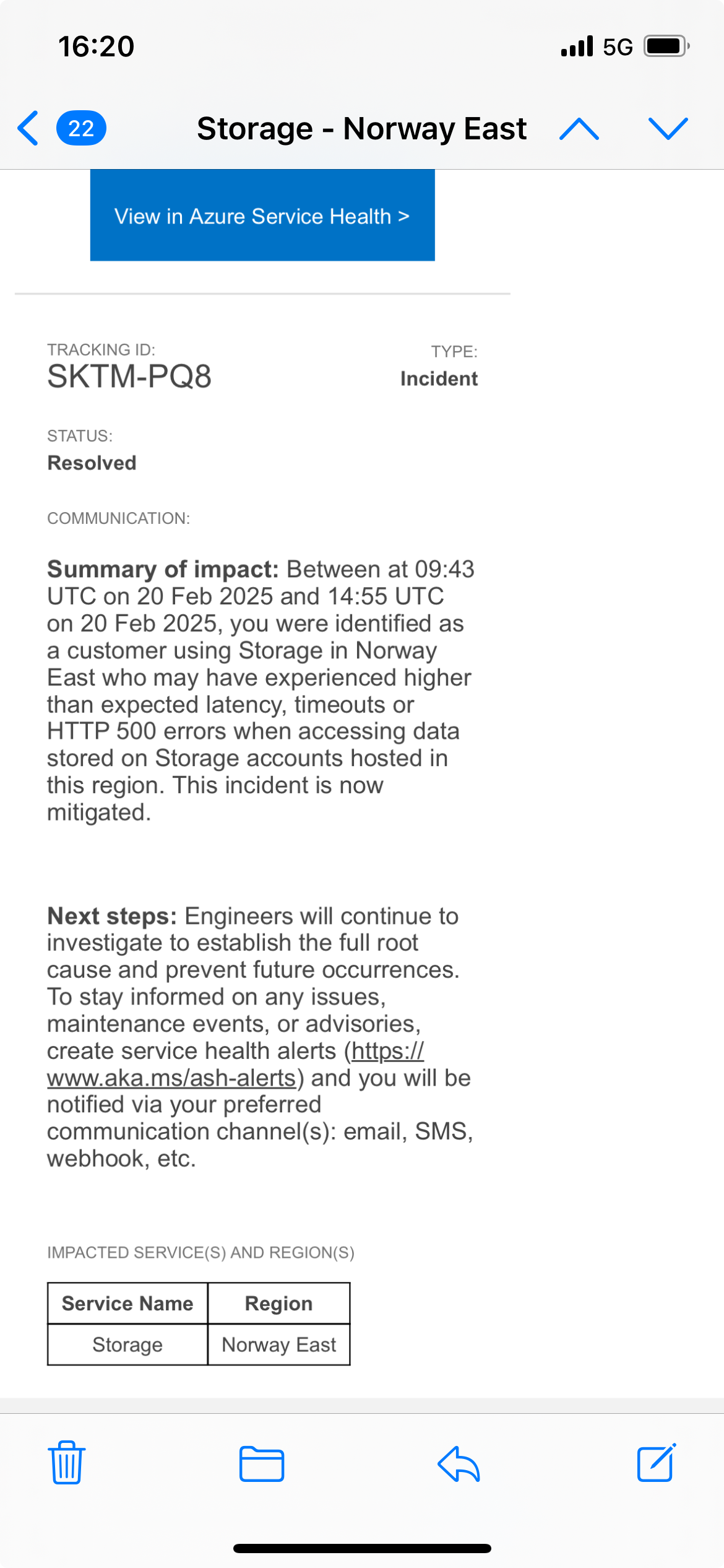 11:37 - Azure Storage Norway East is down, we are looking into a solution