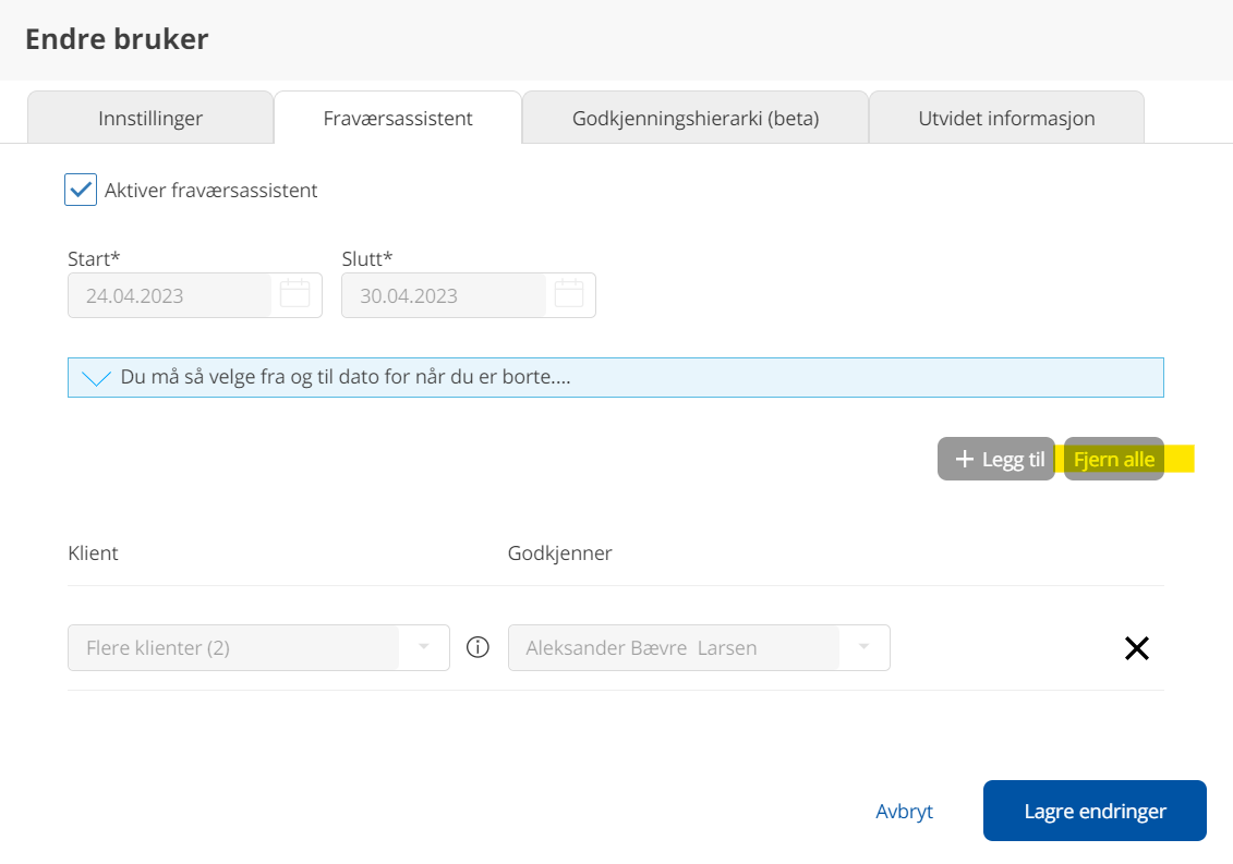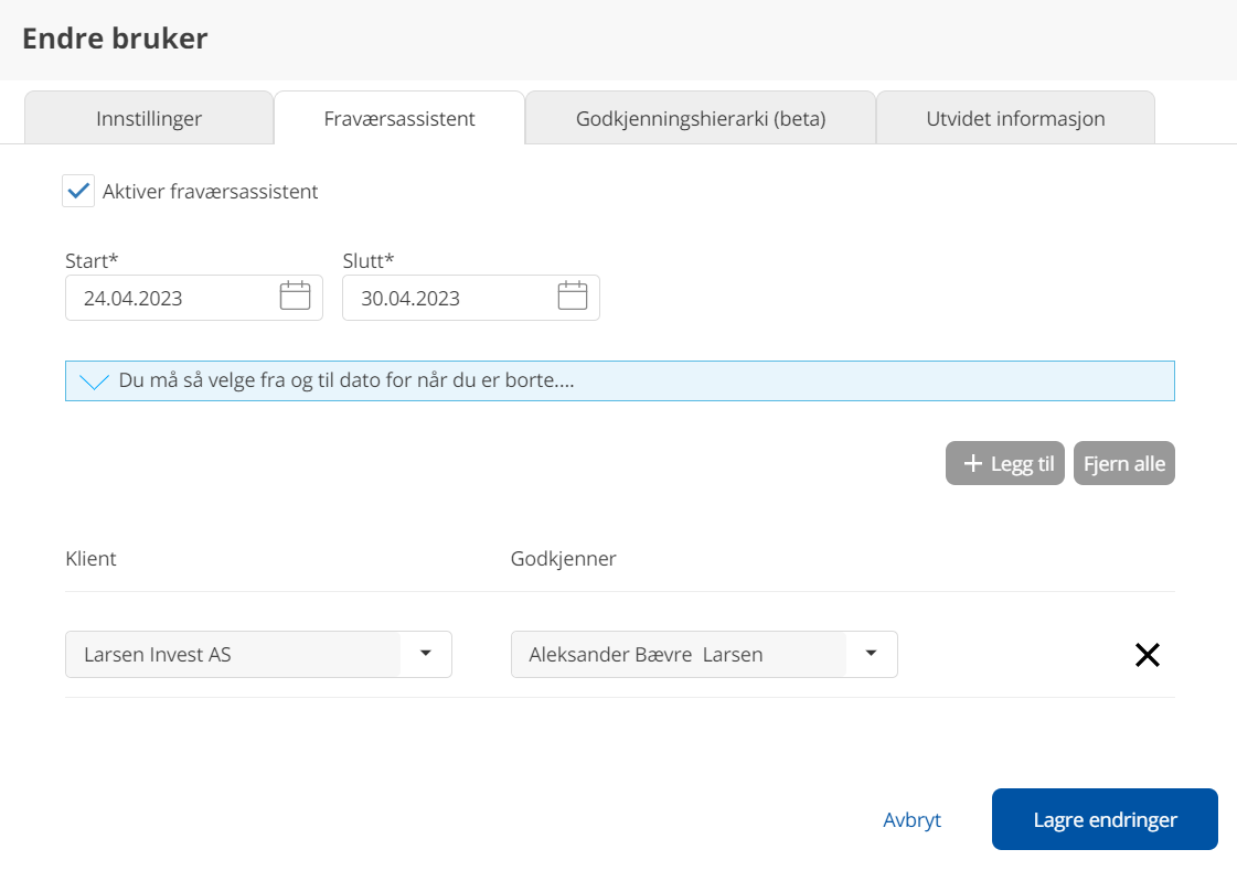 Trykk på "Aktiver fraværsassistent" - Sett periode - Velg Klient og Godkjenner:
