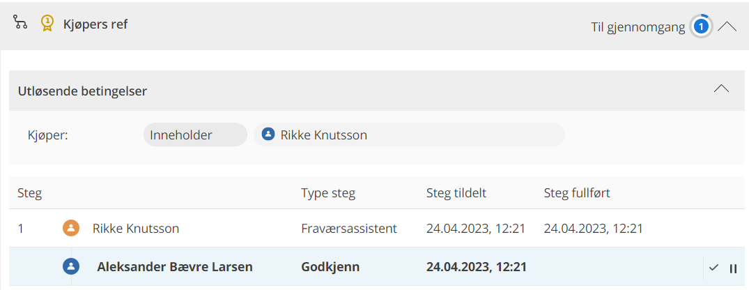 Handlinger: Bruker som er stedfortreder får arvet opprinnelig brukers tilgjengelige handlinger fra arbeidsflyt som er påført. På denne faktura får eksempelvis Aleksander lov til å godkjenne og pause.