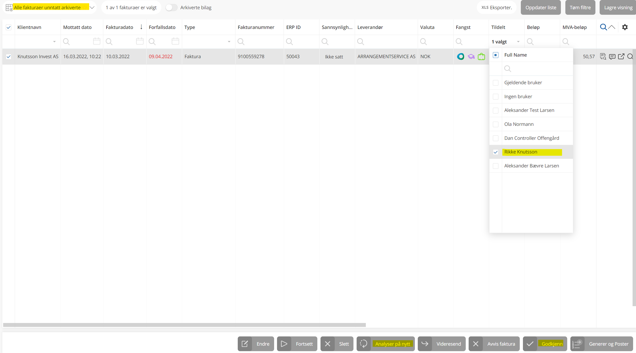 Faktura som allerede ligger til godkjenning hos bruker: For å finne frem til faktura som ligger tildelt bruker, gå til Fakturalisten, velg "Alle faktura unntatt arkiverte" og velg bruker under "Tildelt". Velg da enten overstyring av godkjenning, eller "Analyser på nytt" for å starte flyten på nytt slik at den tildeles stedfortreder: