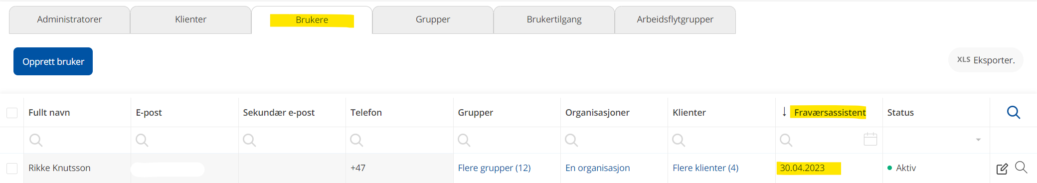 Du vil se sluttdato for fraværsassistent i bruker-listen: