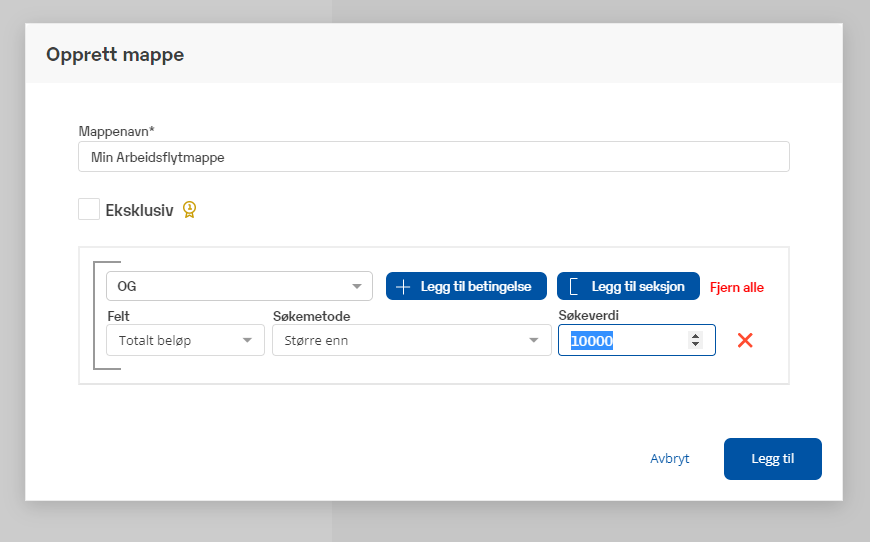 Vi bruker “Total beløp” -> “større enn” -> “10000”
