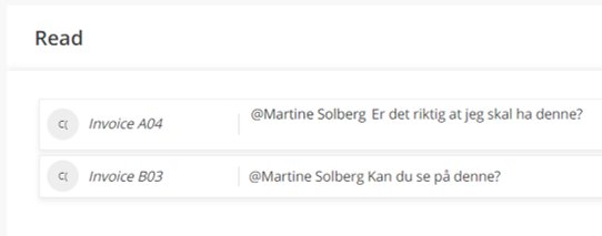 - Til venstre kommer fakturanummeret, så kommentaren, deretter hvilket selskap fakturaen er tilknyttet og til slutt tidspunktet for kommentaren. Ved å klikke på kommentaren vil du bli videresendt til selve fakturaen og kan svare i kommentarfeltet på fakturaens detalj side.