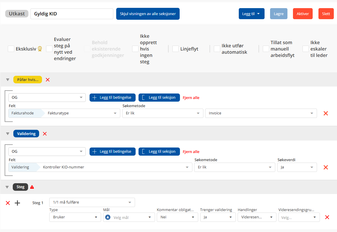 Sett opp arbeidsflyten som vist under for å kontrollere KID på alle fakturaer av typen "Invoice".