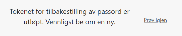 4. "Tokenet for tilbakestilling av passord er utløpt. Vennligst be om en ny": Lenken for bytte av passord har utgått, og du må sende deg selv en ny. Trykk "Prøv igjen", skriv inn din e-postadresse og velg "Send e-post".