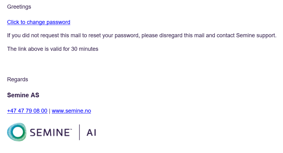 Er man uheldig og glemmer passordet til SEMINE tas "forgot password/glemt passord" i bruk. SEMINE resetter da passordet og sender en lenke på epost for å bytte passordet. Lenken er gyldig i 30 minutter.